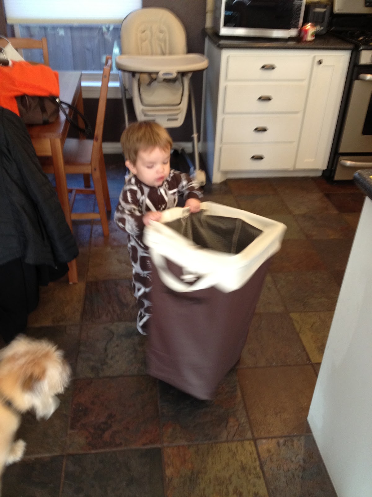 Last weekend I grabbed his laundry and took it to the laundry room and later realized he hadn't followed me back out. Just about the time I was going to go see what he was up to he came out carrying his big hamper. He evidently thought I needed the whole thing: